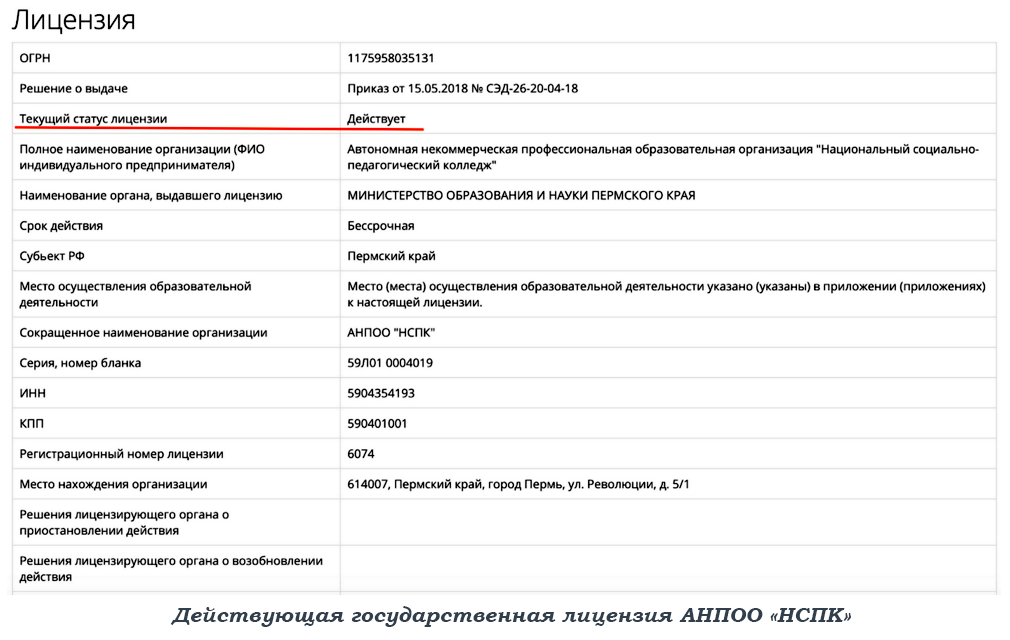 Проверяется на сайте ❯Реестра организаций, осуществляющих образовательную деятельность. Также достаточно ввести только ИНН организации.